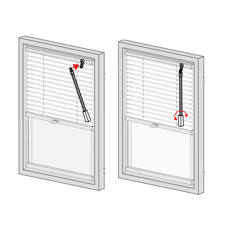 Attach the plastic wand by hooking the wand onto the tilt mechanism on the venetian blind. Twist the wand to open and close the slats.
